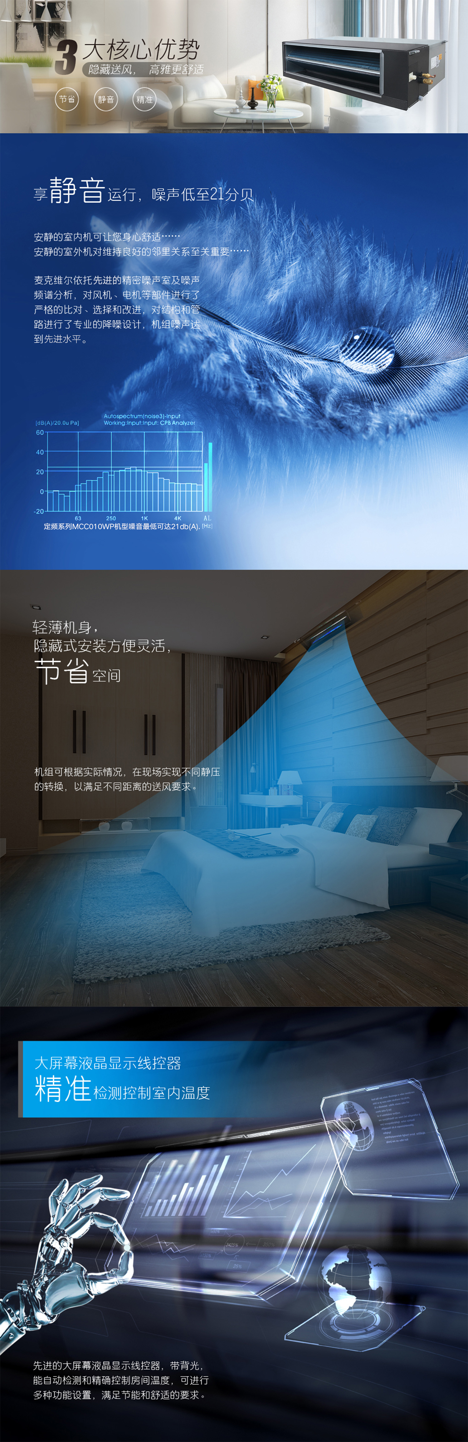 產(chǎn)品理念:采用變頻科技,讓機組時刻處于高效的工作狀態(tài)。應用窄型結(jié)構(gòu)設計,大幅度節(jié)約安裝所用空間,可與各類裝修風格融合。依托于精密噪音實驗室和先進的多通道噪聲分析模擬軟件,通過結(jié)構(gòu)和控制邏輯的優(yōu)化創(chuàng)新,針對性的對室內(nèi)機噪聲源進行遏制和隔斷,打造安靜的室內(nèi)空間。