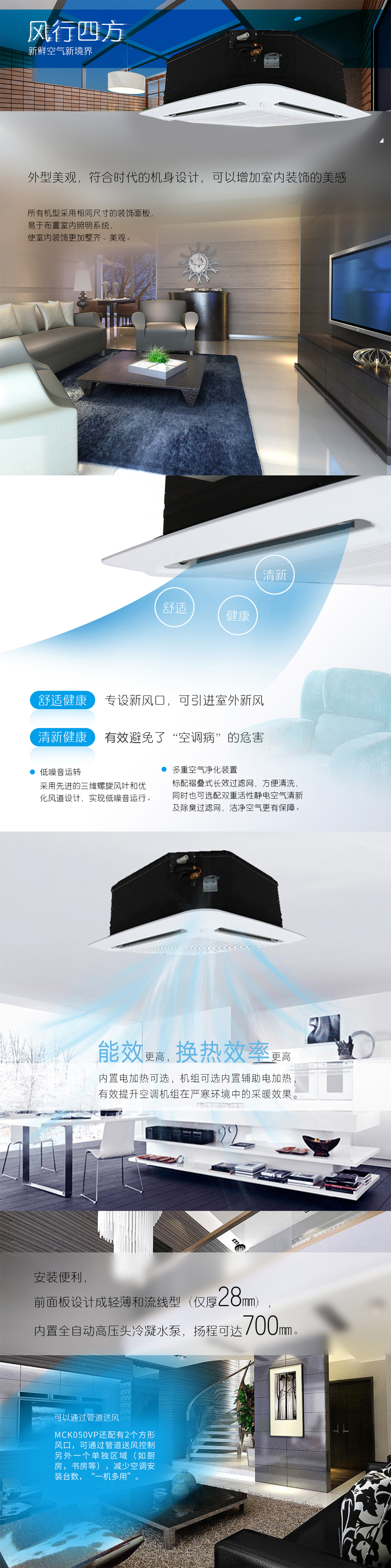 產品理念:新一代環保系列天花嵌入式空調機組,采用先進的空調換氣設計,并通過多重降噪處理,集環保、節能、靜音、清新、舒適于一身,營造一個自然健康的生活環境,可時刻享受清新健康的空氣,擺脫“空調病”的危害。