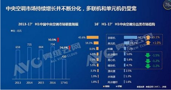 據張彥斌介紹,水冷機、離心機、模塊機等大型商用中央空調增幅呈下降趨勢,而多聯機、單元機增速與增幅都非常可觀。2017上半年,多聯機市場份額占比增加5.1%,增幅達50.7%;單元機市場占比增長1%,增幅19.3%,而許多主流空調企業已經或正在將單元機甚至多聯機等戶式中央空調空調納入家用空調的銷售體系內。