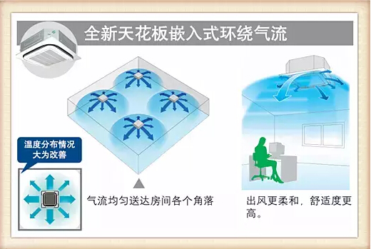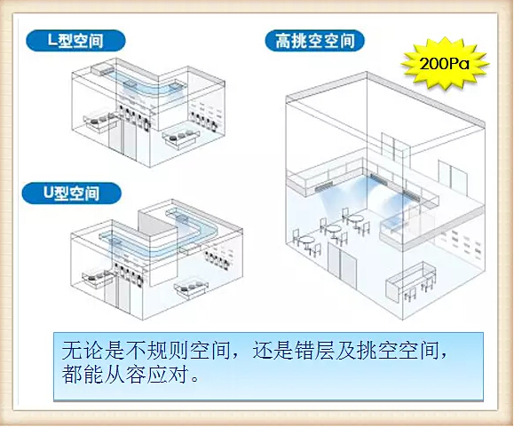 從機(jī)型來看,天花板嵌入式(環(huán)繞氣流)室內(nèi)機(jī),對(duì)應(yīng)大開間和方形空間,氣流均勻,造型更美觀。溫度分布情況大為改善;天花板嵌入導(dǎo)管內(nèi)藏式室內(nèi)機(jī),對(duì)應(yīng)狹長(zhǎng)型、U型和L型等不規(guī)則空間,有多種送回風(fēng)形式,輕松實(shí)現(xiàn)與內(nèi)裝的融合;自由靜壓風(fēng)管室內(nèi)機(jī),對(duì)應(yīng)不規(guī)則空間和挑高空空間,即使內(nèi)裝格局經(jīng)常改變,也能輕松對(duì)應(yīng)。
